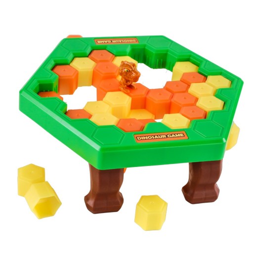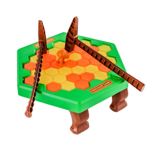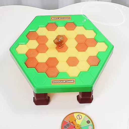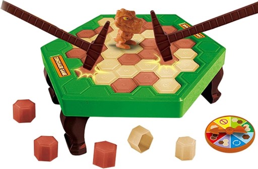 Gra ćwicząca zręczność i refleks. Za pomocą młoteczka dziecko wystukuje kamienie ułożone na blacie stołu, na którym po środku ustawia dinozaura. Na kole fortuny wylosuj swój ruch i wystukaj go na stoliczku. Uwaga! Nie wpadnij w pułapkę przeciwnika! Gracz którem zapadnie się dinozaur przegrywa!