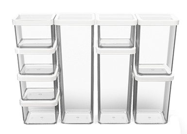 Różne pojemności i kształty pozwalają na dobranie pojemników w taki sposób aby maksymalnie wykorzystać dostępnemu miejsce artykułów sypkich po makarony, kasze ,płatki śniadaniowe, ciastka czy przyprawy. Doskonale sprawdzi się też jako organizer na niewielkie akcesoria kuchenne bądź biurowe.