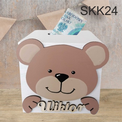 Z przodu skarbonki znajduje się ręcznie malowany przez naszych plastyków dekor oraz drewniany napis z imieniem dziecka.