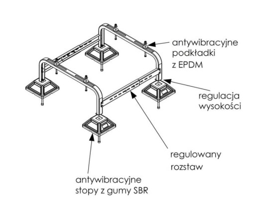 - Dzięki specjalnie zaprojektowanym stopom z gumy recyklingowej SBR, oraz podkładkom EPDM podstawa doskonale redukuje ewentualne hałasy wywołane wibracją urządzenia,