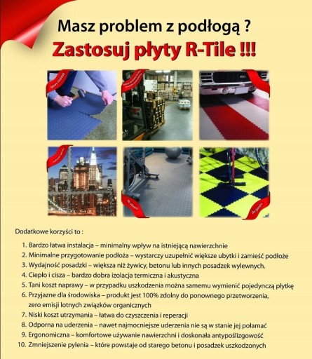Samozamykające, solidne i elastyczne posadzki komercyjne R-Tile są nowoczesnym doskonałym rozwiązaniem w obiektach użyteczności publicznej. Są bardzo łatwe w instalacji, a ich faktura wykończenia zapewnia im bardzo dobrą antypoślizgowość. Płyty układane są bez klejenia, także w każdej chwili można te płyty zdemontować i przenieść w inne miejsce. R-Tile komercyjne są idealne do zastosowania w : biurach, sklepach, szkołach, przedszkolach, korytarzach, showroomach itd.