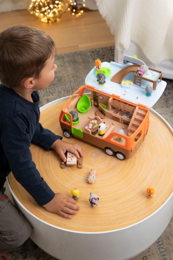 Zestaw zawiera: duży otwierany kamper z rączką do przenoszenia, stół piknikowy, jedno zwierzątko.