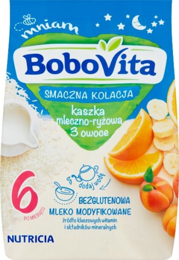 nasza obietnica... Nasze kaszki BoboVita odpowiadają na szczególne potrzeby żywieniowe Twojego dziecka. Z nimi każda chwila ma pyszny smak, a Ty możesz się cieszyć radosnym „Mniam"! Kaszka mleczno-ryżowa 3 owoce została starannie skomponowana tak, by zawierała to, co dobre dla Twojego dziecka: mleko modyfikowane odpowiednie do wieku dziecka + zboża, ryż - ważny składnik zbilansowanego jadłospisu + owoce, pyszny smak bananów, moreli i pomarańczy