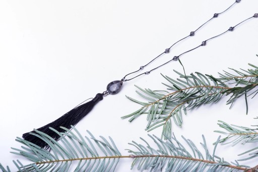 Prezentowany wisior został stworzony przy pomocy kropli labradorytu. Ta podstawa została wykończona za pomocą labradorytów norweskich oraz srebrnych hematytów umieszczonych na wyjątkowo wytrzymałym nylonowym sznurku. Kompozycję dopełnia delikatny frędzelek w czarnym kolorze. Całość można zakładać przez głowę bądź zapinać za pomocą karabińczyka.