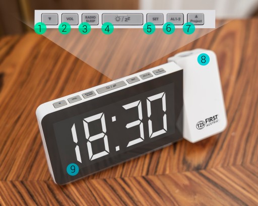 - PROJEKTOR - wyświetla godzinę na ścianie lub suficie, obracany o 180 stopni w pionie