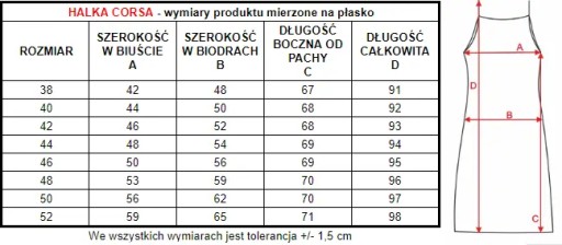 Halka damska Corsa występuje od rozmiaru 36 do 52, dlatego ucieszy panie w każdym rozmiarze. Dzięki zastosowanym regulowanym ramiączkom, halka świetnie dopasowuje się do ciała a dekolt pięknie układa na piersiach. Halka damska jest niesamowicie wygodna, jej dopasowany fason jest prawie niewidoczny pod wierzchnim ubraniem.