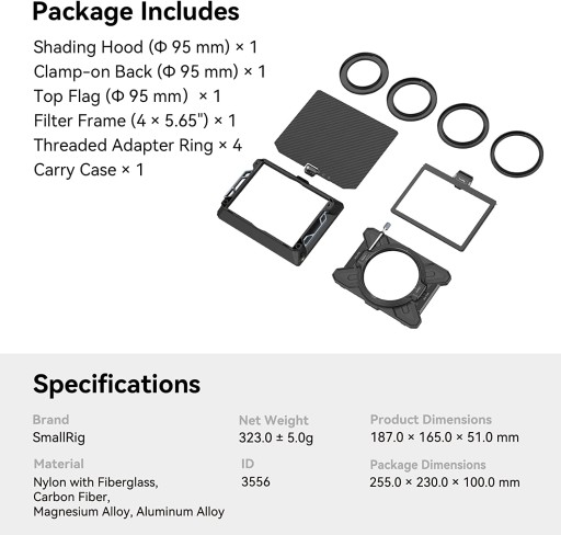 - Wielofunkcyjna modułowa konstrukcja: SmallRig Star-Trail Matte Box Basic Kit 3556 jest przeznaczony do aparatów bezlusterkowych, aby zapobiec oślepianiu i rozbłyskom przez światło słoneczne lub inne światło oraz kontrolować obrazy na ekranie. Jest wyposażony w matowe pudełko z otworem 95 mm, gwintowane pierścienie adaptera, tacę filtracyjną 4x5.65", górną flagę i futerał na aparat.