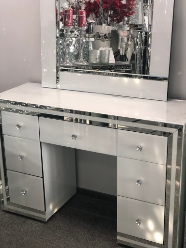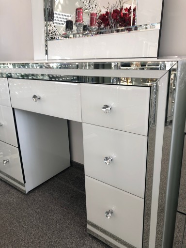 Do kompletu proponujemy piękna biała szklaną toaletkę.