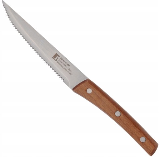 Noże wykonane ze stali nierdzewnej, rękojeść noża jest drewniana .