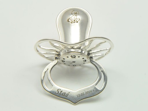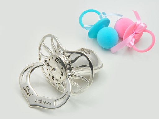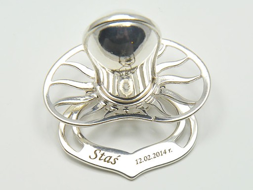Przykładowe wykonanie smoczka z grawerunkiem znajduje się na zdjęciu obok.