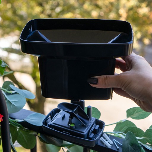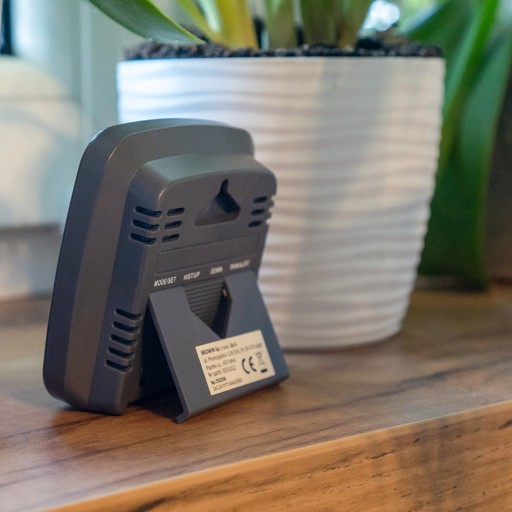 - Do postawienia i zawieszenia - termometr posiada rozkładaną nóżkę (wspornik), a także otwór ułatwiający jego zawieszenie na ścianie. Dołączony do zestawu deszczomierz, posiada kołki i śrubki, umożliwiające jego przytwierdzenie do podłoża.