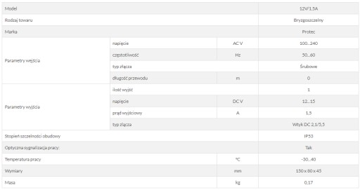 Zasilacz do kamer 12V/1.5A PROTEC impulsowy