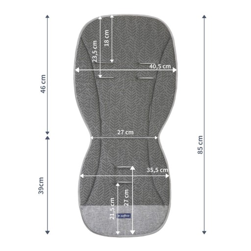 Wkładka wyposażona jest w uniwersalne otwory na pasy bezpieczeństwa na różnej wysokości, dzięki czemu pasuje do większości wózków spacerowych dostępnych na rynku. Chroni tapicerkę wózka przed zabrudzeniem, a wypełnienie z wysokiej jakości pianki nie odkształca się pod wpływem ciężaru dziecka. Kształt wkładki został zaprojektowany w sposób, który umożliwia jej łatwe i szybkie zamontowanie.