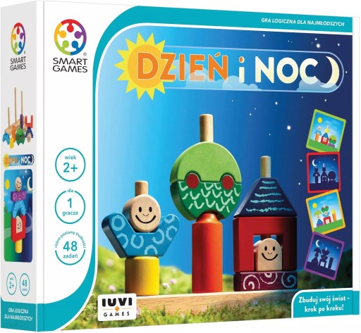 SMART GAMES DZIEŃ I NOC (PL) IUVI GAMESWitaj w świecie gry Dzień i Noc - logicznej układanki dla najmłodszych. Dziecko rozwiązując kolejne zadania dzienne, polegające na odpowiednim układaniu klocków, ćwiczy koncentrację i zdolności manualne. Dla małych graczy, szukających większych wyzwań przygotowano zadania noce, które dodatkowo trenują wyobraźnię i zdolności analityczne!Proste zasady, duże, bezpieczne elementy i możliwość zabawy jak w zwykłe klocki - to gotowyprzepis na świetna gra na długie popołudnia! Nauka przez zabawę, to wspólna cecha wszystkich Smartów! Poznaj je już dziś!Za co Twoje dziecko pokocha tę grę?Można się nią bawić jak zwykłą zabawkąDwa rodzaje zagadekĆwiczy koncentrację i zdolności manualneSpis komponentów:drewniana podstawa10 kolorowych drewnianych klockówksiążeczka z 48 zadaniami i ich rozwiązaniamiwiek: +2