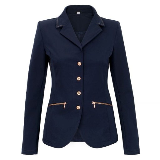 Elegancki, taliowany oraz bardzo elastyczny frak zapinany na zamek oraz piękne guziki w kolorze różowego złota z zatopionymi drobinkami brokatu. Dodatkowo ozdobne zamki oraz przeszycia również w kolorze rosegold.
