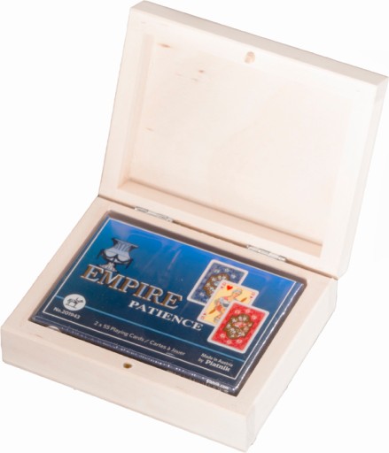 Najwyższej jakości karty do pasjansa renomowanej firmy Ferd. Piatnik & Sohne. "Empire" to najbardziej lubiany Piatnikowski wzór pasjansowy. Na rewersach (koszulkach) delikatny motyw kwiatowy. Eleganckie pudełeczko kryje 2 niewielkie talie. Mniejszy format sprawia, że łatwiej układa się pasjansa. Talie składają się z 55 plastikowanych kart o wymiarach 44 x 66 mm i gramaturze 310.