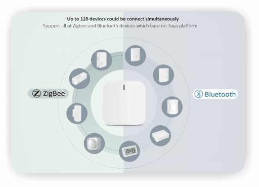 Multi-mode Gateway, zwana inaczej bramką Zigbee / Bluetooth, to nic innego jak centralka obsługująca różnego rodzaju urządzenia Smart Home. Bramka Zigbee oprócz sterownika ogrzewania podłogowego oraz czujników temperatury znajdujących się w zestawie, pozwala na podłączenie innych urządzeń współpracujących z aplikacją Tuya / Smart Life opartych o protokół przesyłania danych Zigbee oraz Bluetooth.