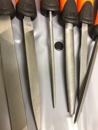 - Zestaw zawiera pilniki: płaski, płaski o zbieżnych krawędziach, kwadratowy, trójkątny, półokrągły i okrągły