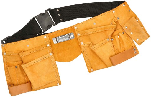 Pas posiada 11 kieszeni, w tym 4 kieszenie na gwoździe i drobne elementy oraz 7 kieszeni na narzędzia. Ponadto dwa uchwyty na młotek lub siekierę, itp oraz uchwyt na taśmę mierniczą.