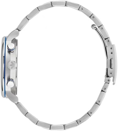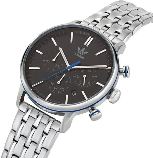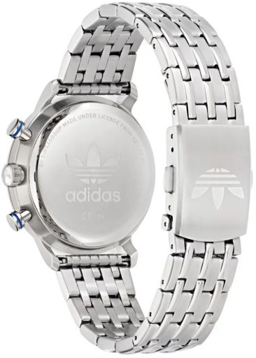 Zegarek ADIDAS ORIGINALS AOSY22018 wyposażono w analogowe wskazanie czasu. Wskazówki oraz indeksy godzinowe w srebrnym kolorze doskonale kontrastują z barwą tarczy. Dodatkowo wskazówki wypełniono masą luminescencyjną, co umożliwia odczyt w ciemności. Na cyferblacie znajdują się trzy subtarcze, które nadają czasomierzowi dynamiki i nieco sportowego stylu. Model posiada wbudowany chronograf, który umożliwia działanie manualnego stopera. Na godzinie czwartej trzydzieści umieszczono niewielkie okienko datownika, wskazujące aktualny dzień miesiąca. Przykuwającym wzrok elementem jest niebieska wskazówka sekundowa, która zdecydowanie wyróżnia się na tle stonowanej stylistyki czasomierza. Klasa wodoszczelności wynosi 5 ATM (WR50m) oznacza to, że zegarek jest odporny na krótkotrwałe zanurzenie w wodzie, np. podczas mycia rąk czy w czasie deszczu.