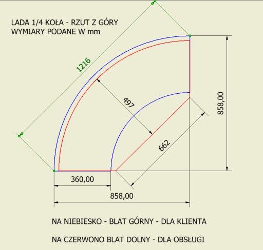 - Lada 1/4 koła o promieniu 83 cm , obwód zew. 130 cm. Wysokość lady 116 cm;