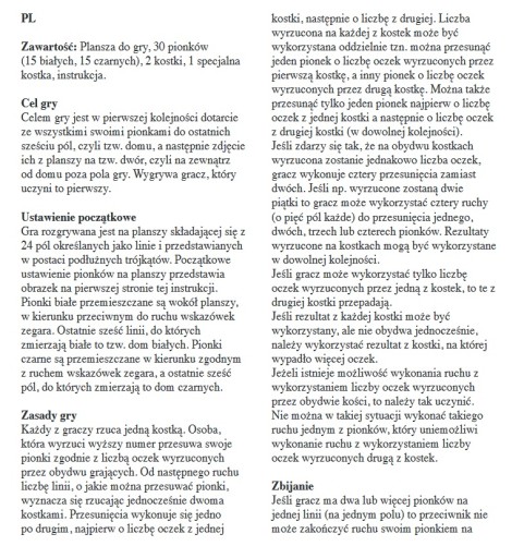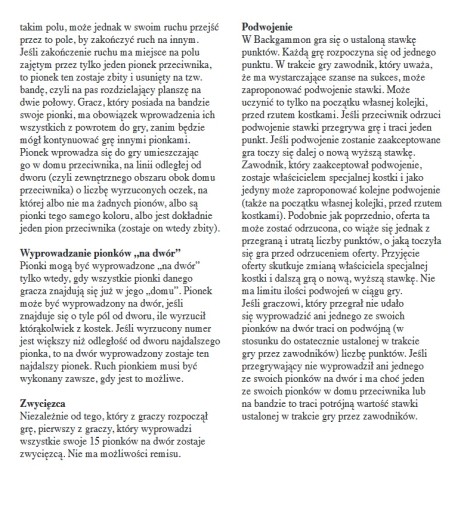 Każdy z graczy dysponuje 15 pionkami, które przesuwa po planszy, składającej się z 24 pól (trójkątów), zgodnie z liczbą oczek wyrzuconych na dwóch kostkach.