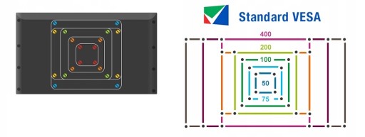 - VESA: 75x75, 100x100, 200x200, 200x300, 300x300, 300x400, 400x400.