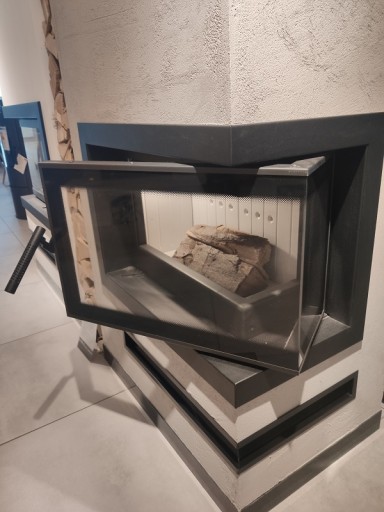 Wkład kominkowy z dwoma szybami zestawionymi ze sobą pod kątem prostym.
