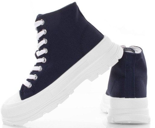 Damskie wysokie buty sportowe a'la trampki. Wykonane z materiału tkaninowego na grubszej, wygodnej podeszwie z platformą. Model ze sznurowaną cholewką, tkaninowa wkładka.