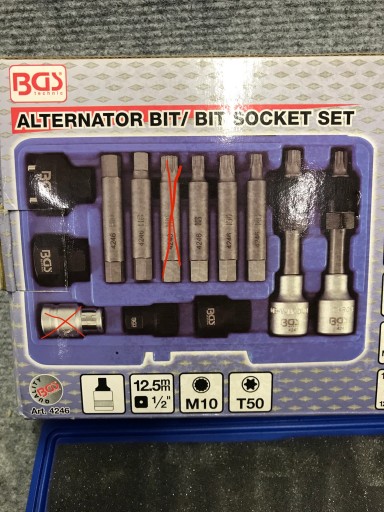 - specjalny zestaw bitów z kluczami do alternatorów (również do sprężarki układu klimatyzacji) do montażu koła pasowego ze sprzęgłem jednokierunkowym