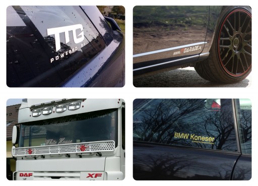 Napisy wykonane z folii winylowej, jednolicie kolorowej, nie posiadające żadnego tła. Każda naklejka jest wycięta osobno, naniesiona na papier lub prześwitującą folię transportową. Drobne napisy przeważnie są na folii transportowej natomiast większe motywy są na papierze.