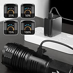 Latarka led usb do ponownego ładowania i ulepszony akumulator 26700 wysokiej wydajności - w latarce LED zastosowano ulepszony akumulator 6000 mAh 26700, który ma o 50% wyższą energię rozładowania w porównaniu z akumulatorami 18650/26650 o pojemności 5000 mAh i może zapewnić do 12 godzin (tryb średni) silnej jasności. Dzięki wbudowanemu interfejsowi USB ładowanie jest wygodniejsze.