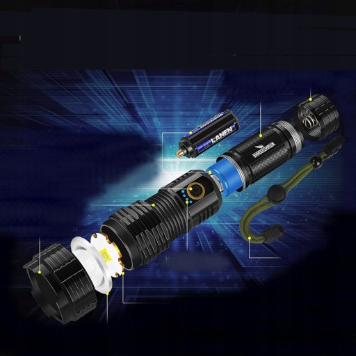 Latarka LED jest bardzo jasna wyposażona w ulepszony chip XHP70.2. Latarka LED wytwarza bardzo wysoką wydajność do 10 000 lumenów, dziesięciokrotnie większą niż w przypadku normalnej latarki LED.
