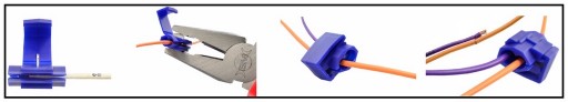 Połączenie następuje poprzez zamknięcie zatrzasku, specjalna blaszka nacinając lekko izolację łączy ze sobą dwa przewody.