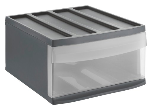 Na tej aukcji kupują Państwo: Szuflada L Systemix marki Rotho w kolorze transparentnym/antracyt. Poniższa aranżacja może prezentować inne modele i warianty pojemników serii Systemix Rotho dostępne na naszych pozostałych aukcjach allegro.