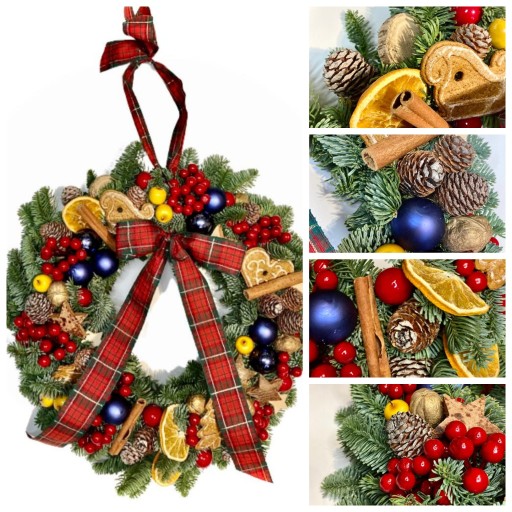 Przedmiotem sprzedaży jest przepiękny, ręcznie wykonany, wianek bożonarodzeniowy na drzwi (i nie tylko!).