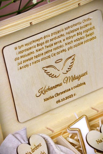 Wszystkie widoczne przedmioty w przegródkach DOŁĄCZANE SĄ do prezentu. Więc nie musisz się o nic martwić!(różaniec, świeczka 1, pudełeczko na ząbek z grawerem, aniołek, skarpetki oraz woreczek lniany - "na drobne wydatki", który wystarczy uzupełnić drobnym upominkiem pieniężnym)