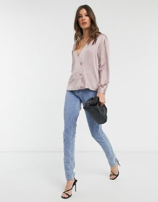 ВЫСОКАЯ РОЗОВАЯ АТЛАСНАЯ РУБАШКА НА ПУГОВИЦАХ 40 1DUT