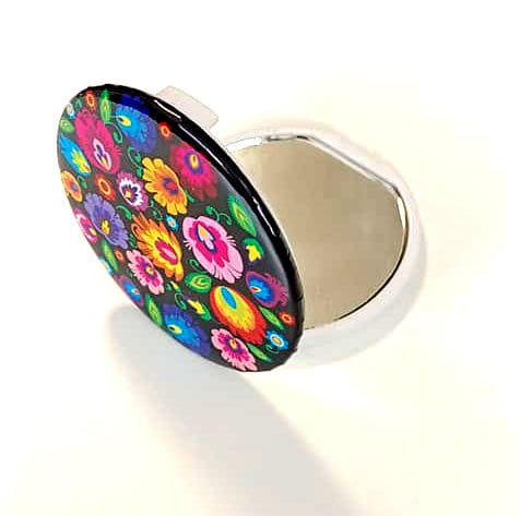 Wzór na lusterku przedstawia kwiaty z wycinanki łowickiej na czarnym tle.