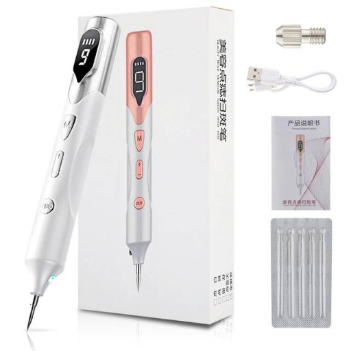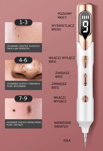 - Długopis posiada 9 poziomów mocy, dzięki czemu możesz w precyzyjny sposób dobrać moc urządzenia do zmiany skórnej, którą chcesz usunąć.