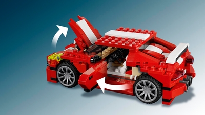 Poczuj potężną moc drzemiącą pod maską tego szpanerskiego samochodu sportowego typu 3 w 1 z zestawu Czerwone konstrukcje.