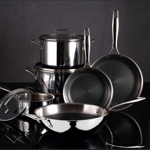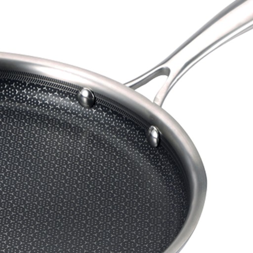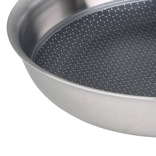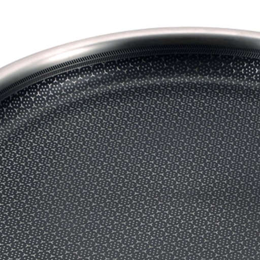 Trójwarstwowa budowa dna w gramaturze plastra miodu zapewnia niezwykłą wytrzymałość na uszkodzenia mechaniczne oraz zapobiega przypalaniu i przywieraniu żywności do powłoki.