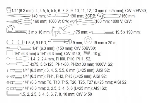 Profesjonalny zestaw narzędziowy dla elektryków. Zawiera 68 specjalnie wyselekcjonowanych narzędzi. Jest to doskonała propozycja zarówno dla branży elektroinstalacyjnej, jak i motoryzacyjnej. Szczypce i wkrętaki w zestawie posiadają izolowane do 1000V rękojeści VDE.