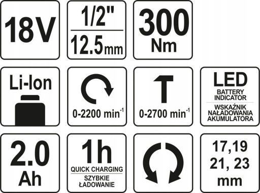 АККУМУЛЯТОРНЫЙ КЛЮЧ YATO 18 В + 4 НАСАДКИ 1/2 дюйма, 300 Нм, 2,0 Ач, НАБОР