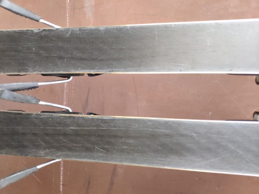 Stan DB - Narty posiadają normalne ślady użytkowania otarcia, nacięcia i ślady po ostrzeniach w serwisie