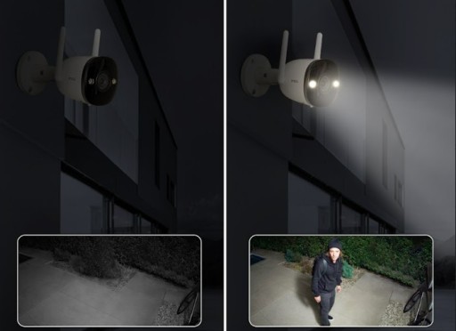 Kolorowy obraz o wysokim poziomie jasności. Dzięki dwóm wbudowanym reflektorom kamera posłuży też jako zewnętrzne oświetlenie domu.