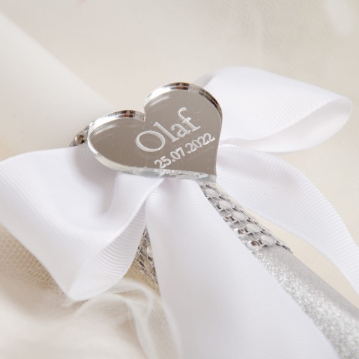 Piękna świeca do Chrztu Świętego, ręcznie zdobiona. Przygotowana z największym wyczuciem stylu. Wykonana z najwyższej jakości komponentów. Świeca wykonana w biało-srebrnej kolorystyce, która idealnie sprawdzi się zarówno jako Pamiątka Chrztu Świętego dla dziewczynki, jak i dla chłopca. Uroku dodaje jej kokarda, na której umieszczona jest personalizacja wygrawerowana na srebrnym lustrze akrylowym.
