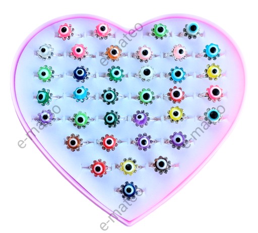 - 36 pierścionków z błyszczącymi elementami umieszczono w pudełeczku w kształcie serca.
