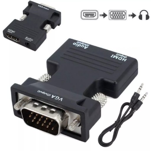 Adapter konwertuje cyfrowy sygnał HDMI do sygnału analogowego VGA plus dźwięk audio ( podawany przez kabel Jack )