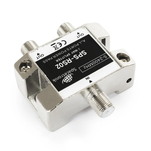 Wysokiej jakości małostratny ekranowany splitter, (rozgałęźnik sygnału telewizyjnego), posiadający 1 wejście i 2 wyjścia.